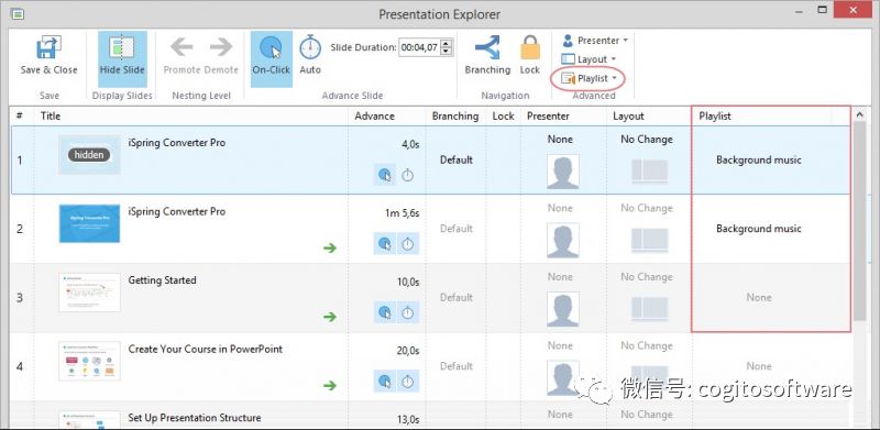 现在,您可以使用升级的Presentation Explorer界面创建音频播放列表并将播放列表应用于任何演示幻灯片。此外,您可以调整背景音频音量并使用循环播放功能。