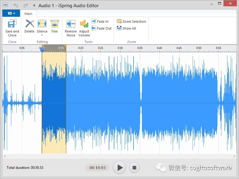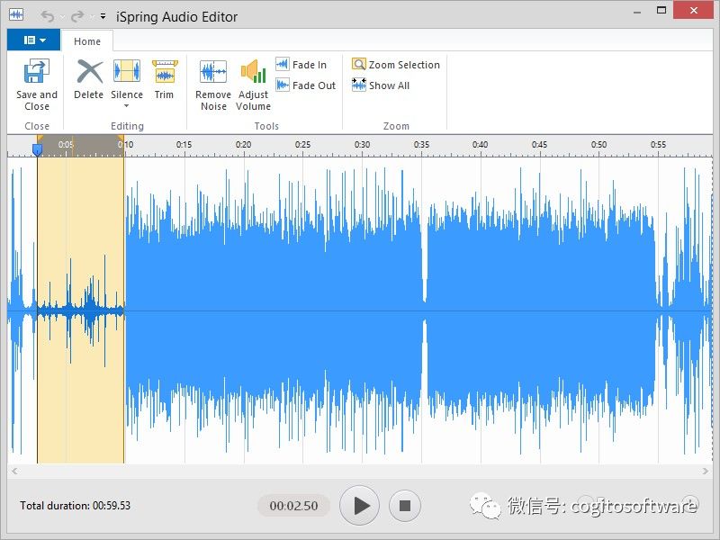 iSpring QuizMaker 8.3中的音频编辑器提供了创建音频旁白快速简便所需的所有功能:降噪,剪切剪辑的片段,调节音量等